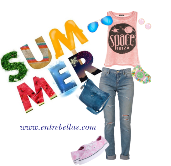 Este outfits de moda 3 es muy fresco y juvenil para esta temporada veraniega. Este outfits esta compuesto por unos jeans o vaqueros muy de moda con las aberturas tipos rasgaduras, combinada con un top de algodón, excelente textura para estos días de verano y en un tono rosa. Se acompaña con unas zapatillas deportivas en color rosa, una cartera para llevar cruzada de jeans. Los accesorios de este look las infaltables gafas de sol tipo aviador, muy de moda y un reloj tipo pulsera muy juvenil y los aretes unas perlitas en rosado. Este outfits de moda es ideal par ir hacer compras, pasear, ir al cine, es super cómodo.