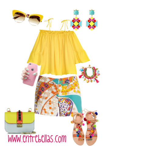 El outfits de moda 2 como puedes ver es muy veraniego, tanto por las prendas como por sus colores, como el amarillo, el turquesa y el rosa; los colores de esta temporada. Este outfits es ideal para salir al cine, de paseo por parque a tomar unas cañitas con amigas, a tomar un helado, es un look muy fresco. Este look esta compuesto de una blusa en una tela muy fresca y con un corte campestre donde podrás exhibir tus hombros, la tendencia del momento y el color en amarillo alegre. Se ha combinado esta blusa campestre con un short colorido que le da un toque como retro por su estampado, tiene variedad de tonos como el amarillo, el turquesa, el naranja, el morado y el blanco. El calzado son unas sandalias que están causando furor esta temporada, sandalias coloridas de pompones, que le va de un estupendo a este outfits; combinado con una cartera pequeña de colores y que la puede llevar cruzada. Los accesorios están fabulosos porque le dan ese toque elegante y jovial a la vez, los zarcillos son con un estilo muy de moda y colores que combinan perfecto; la pulsera muy alegre y con cordones que va excelente con las sandalias. Y no puede faltar para estos días de tanto sol unas gafas amarillas retro.