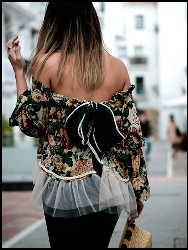 Este diseño de la blusa Casandra mezcla muchas tendencias, como el tul, el color rosa,los volantes en mangas y en el escote de la espalda.