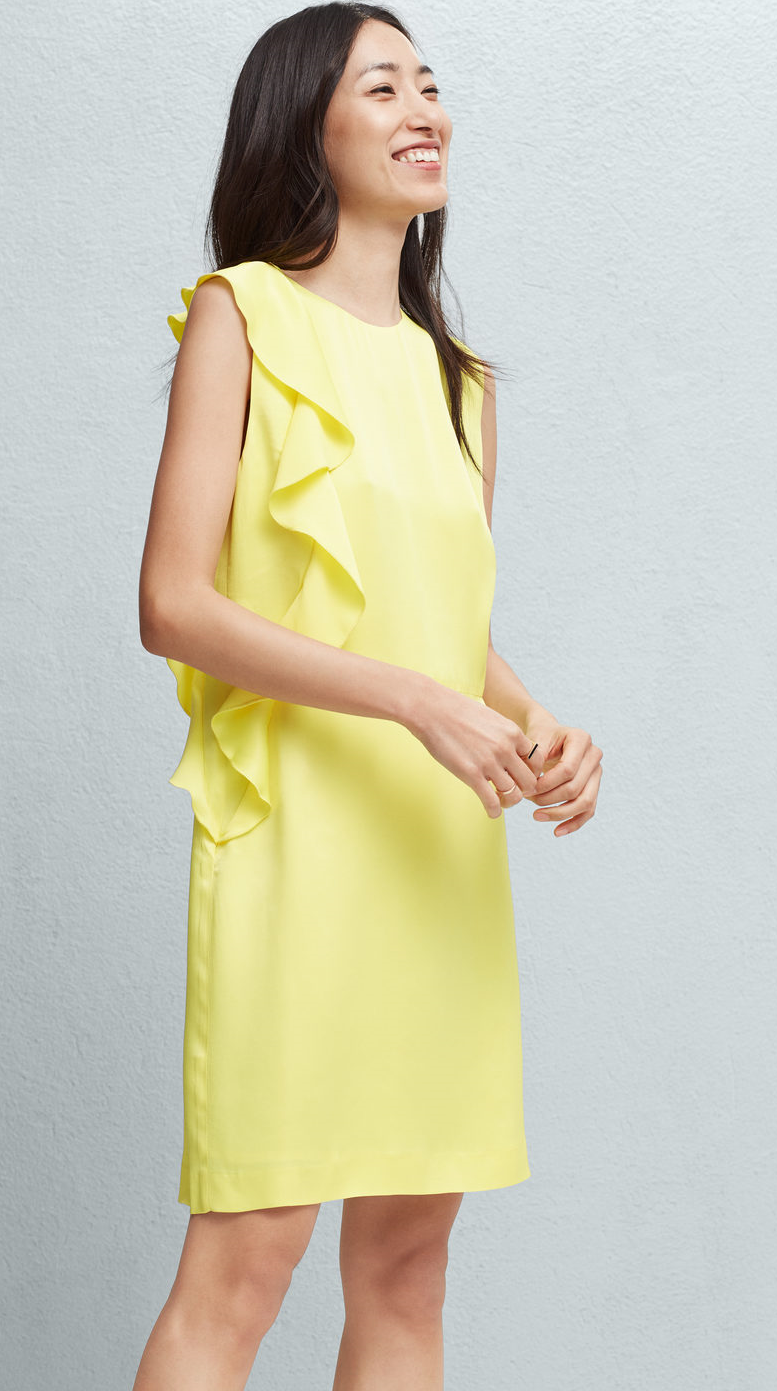 Vean este vestido amarillo de cuello redondo de Mango, lo puedes combinar con negro y por qué no con rosa, lo puedes llevar por 39,99€