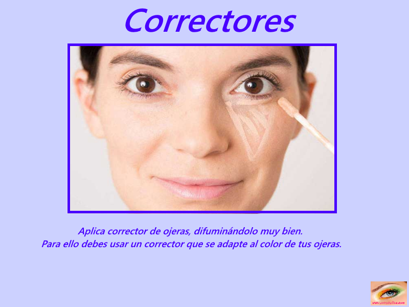 Aplica corrector de ojeras, difuminándolo muy bien. Para ello debes usar un corrector que se adapte al color de tus ojeras.