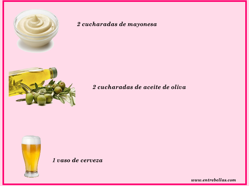Otro tratamiento natural para el cabello es mezclar 2 cucharadas de aceite de oliva, 1 vaso de cerveza y 2 cucharadas de mayonesa. Esta mascarilla la aplicas en el cabello desde la mitad hacia las puntas y lo dejar por media hora. Lo retiras con abundante agua tibia. Este tratamiento para el cabello lo puedes aplicar 2 veces a la semana.